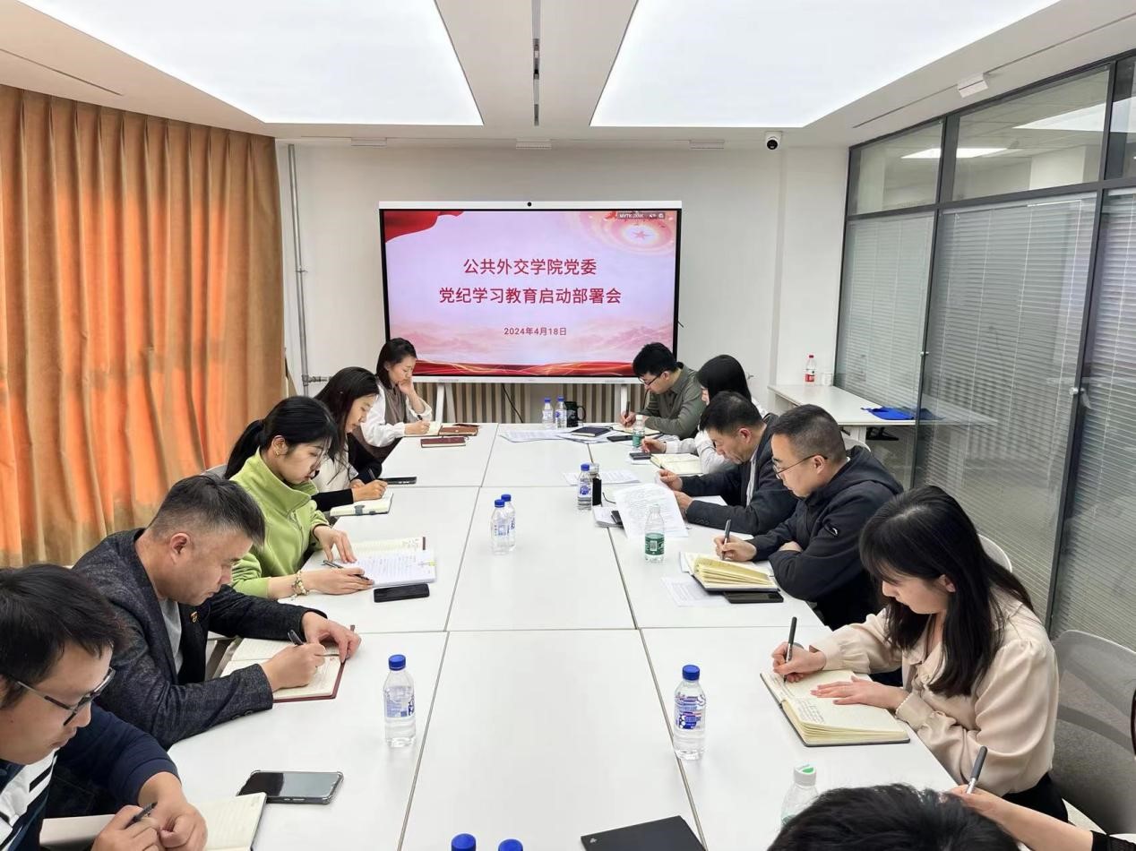 2024年4月18日下午,公共外交学院党委在吕振羽楼8楼会议室召开党纪学习教育启动部署会议,会议由党委书记杨民同志主持,学院党委委员、纪委委员、党支部书记、党委办公室成员、管理团队全体党员参加了会议。